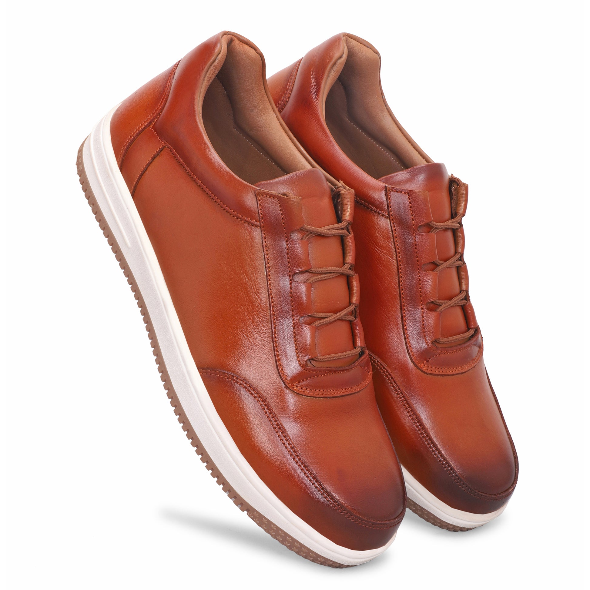 Blend comfort with smart-casual style in these Men’s Tan Leather Sneakers. Designed with a rich tan leather upper and a sporty white midsole, they give you the clean, polished look of laces—without actually needing to tie them. The slip-on design makes them easy to wear, while the cushioned insole and grippy rubber sole keep every step light and steady. Great for weekend outings, travel, or laid-back office days, these sneakers deliver everyday style with zero hassle.
