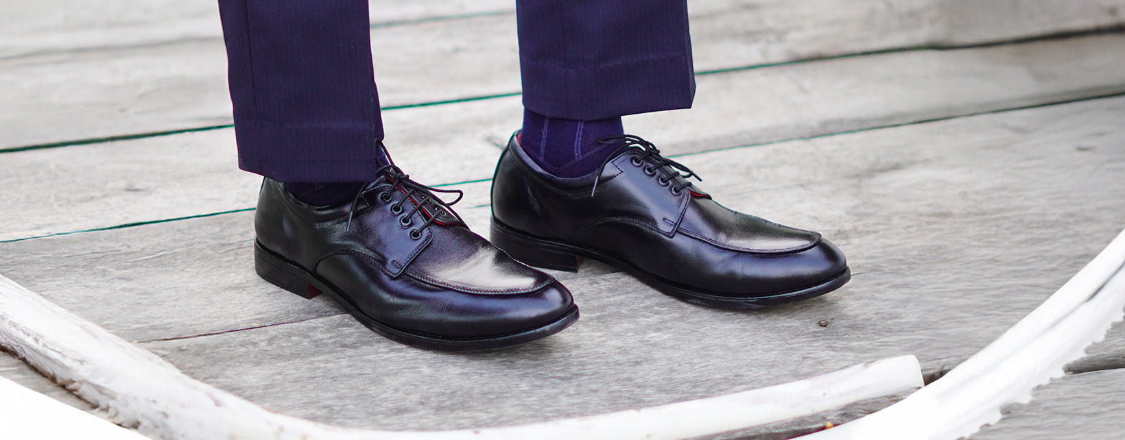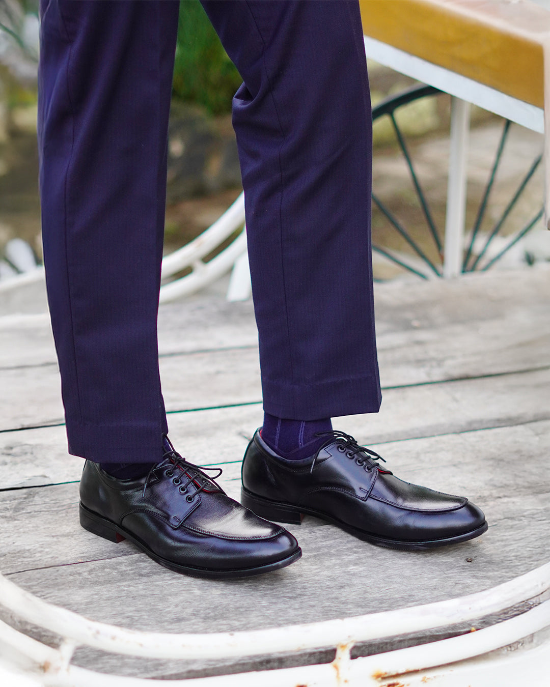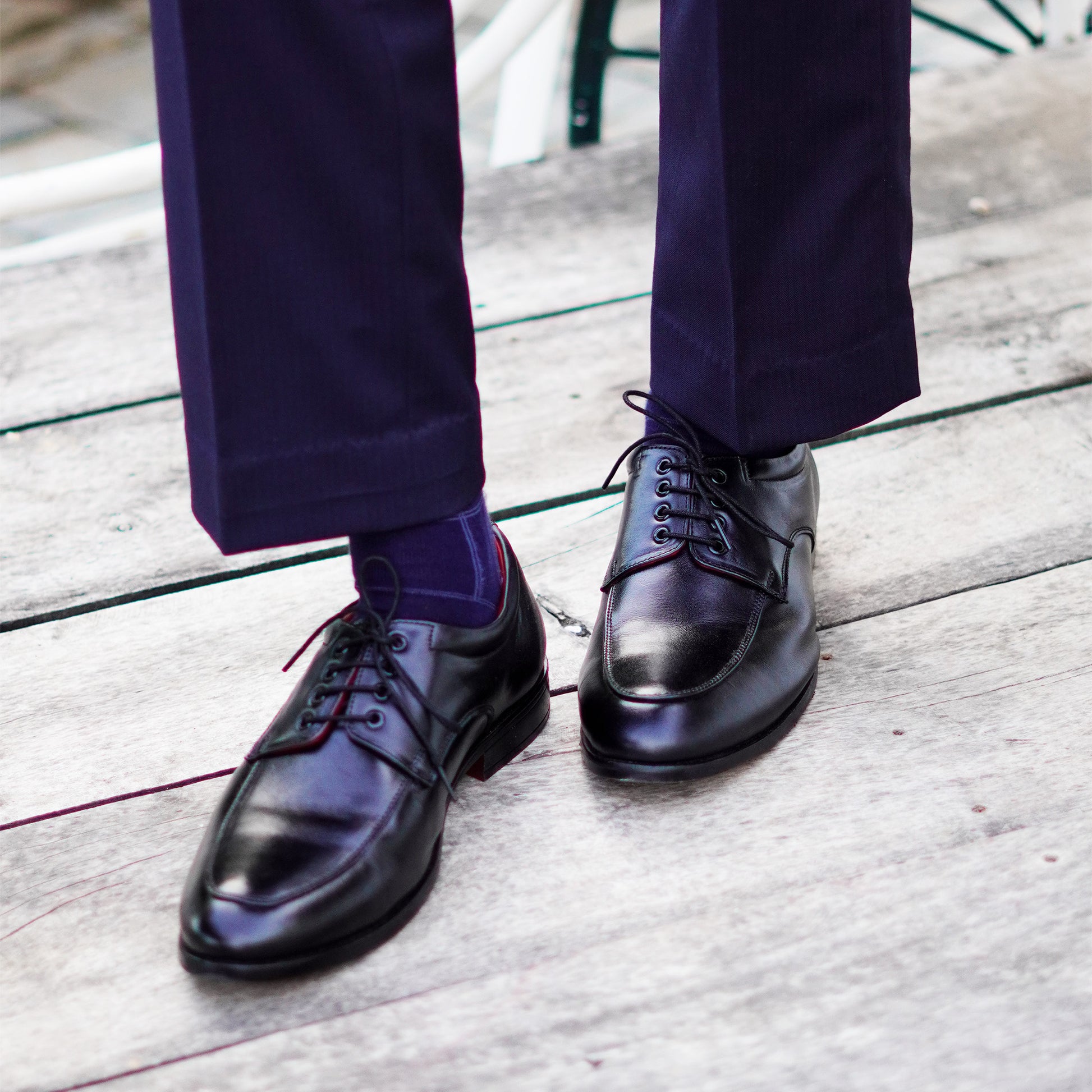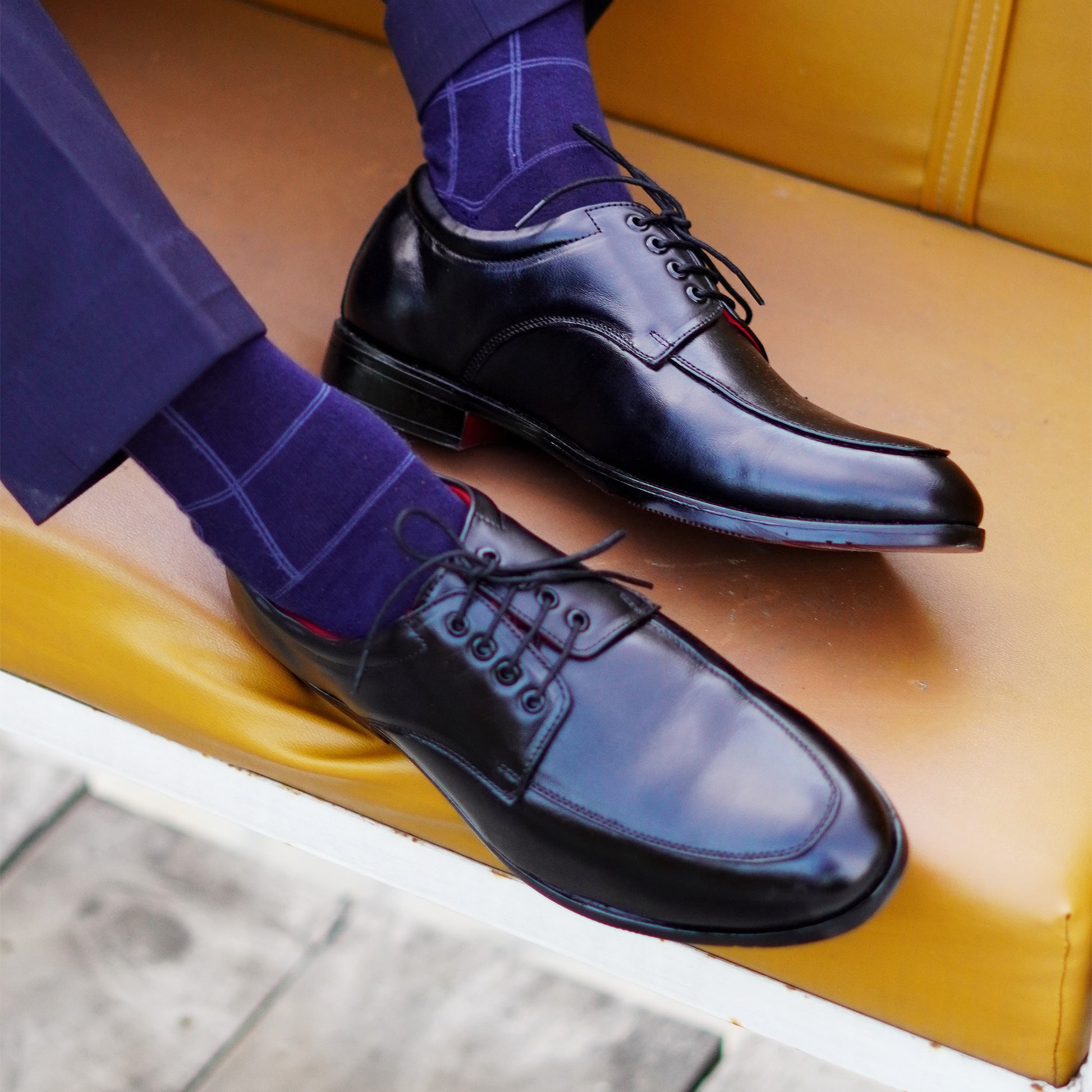 MATR's black leather apron toe derby shoes offer a modern take on classic formalwear, blending sleek design with sophisticated details for a truly polished look.